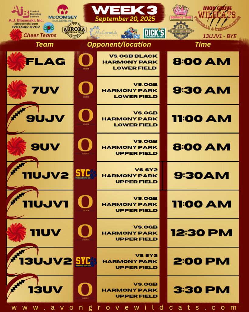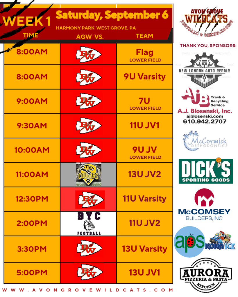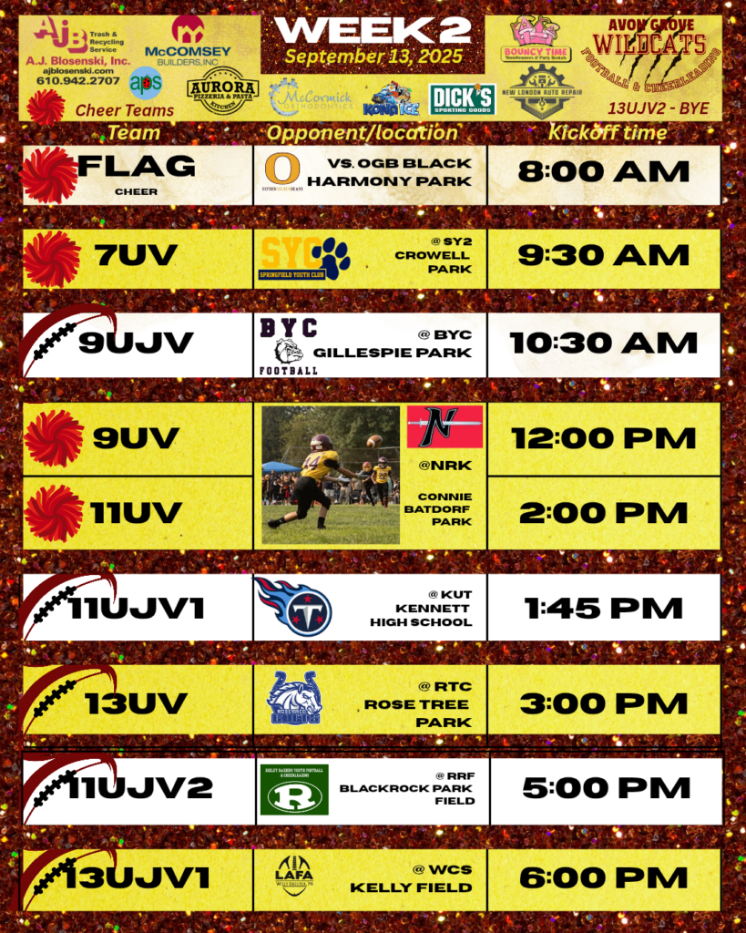 Sponsoring a nonprofit youth sports organization like the Avon Grove Wildcats is beneficial to our cheer and football athletes as well as your business. We will work with you to make sure your business has proper signage, a part in our announcements and placement on our social media posts. To learn more about these opportunities,…