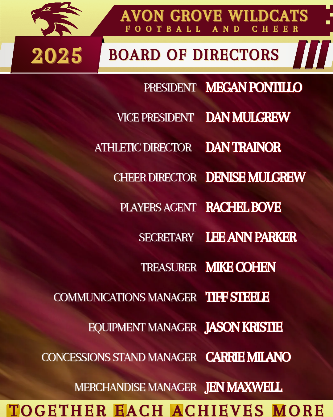 OUR STAFF We are currently seeking a Treasurer for the 2026 season! Interested candidates please email info@agwildcats.com Contact Avon Grove Wildcats PO BOX 103 West Grove, Pennsylvania 19390 Email: info@agwildcats.com Site Links Wildcat FAQs IYFL Registration Locations About Us